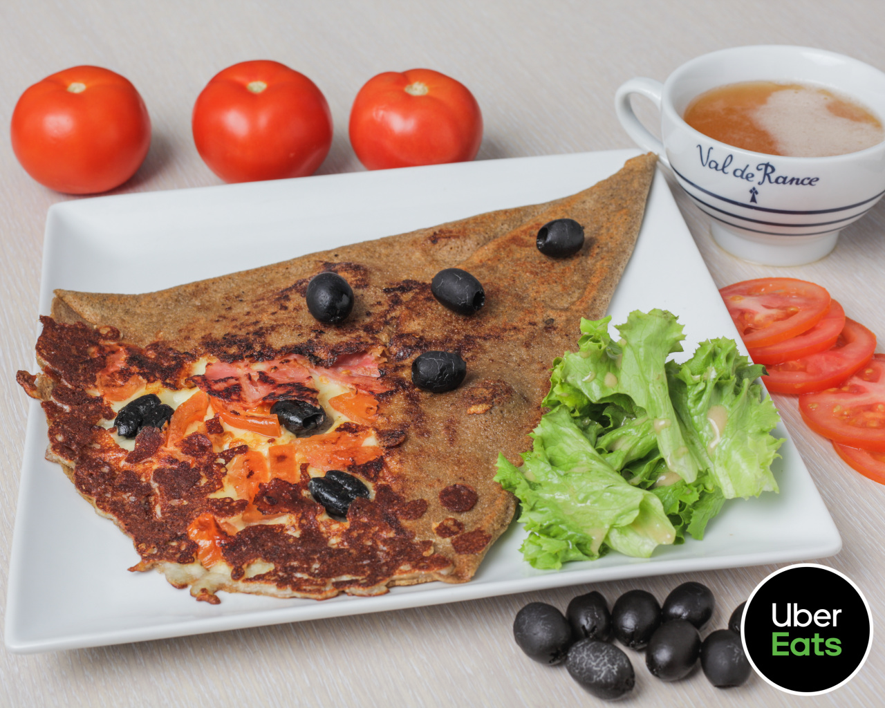 Mozzarella, tomates fraîches,olives noires, marinade de basilic, jambon OU, thon OU poulet, salade.