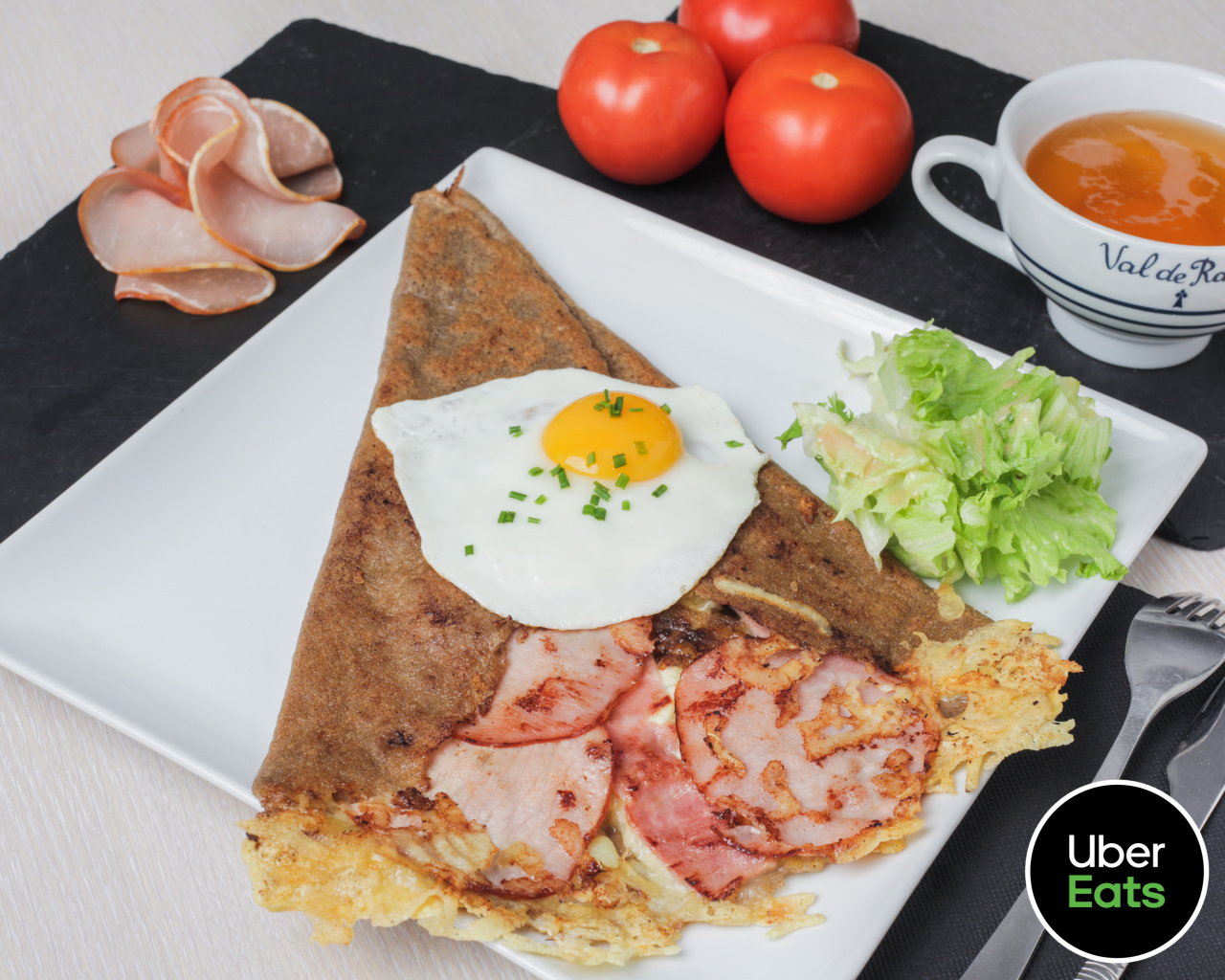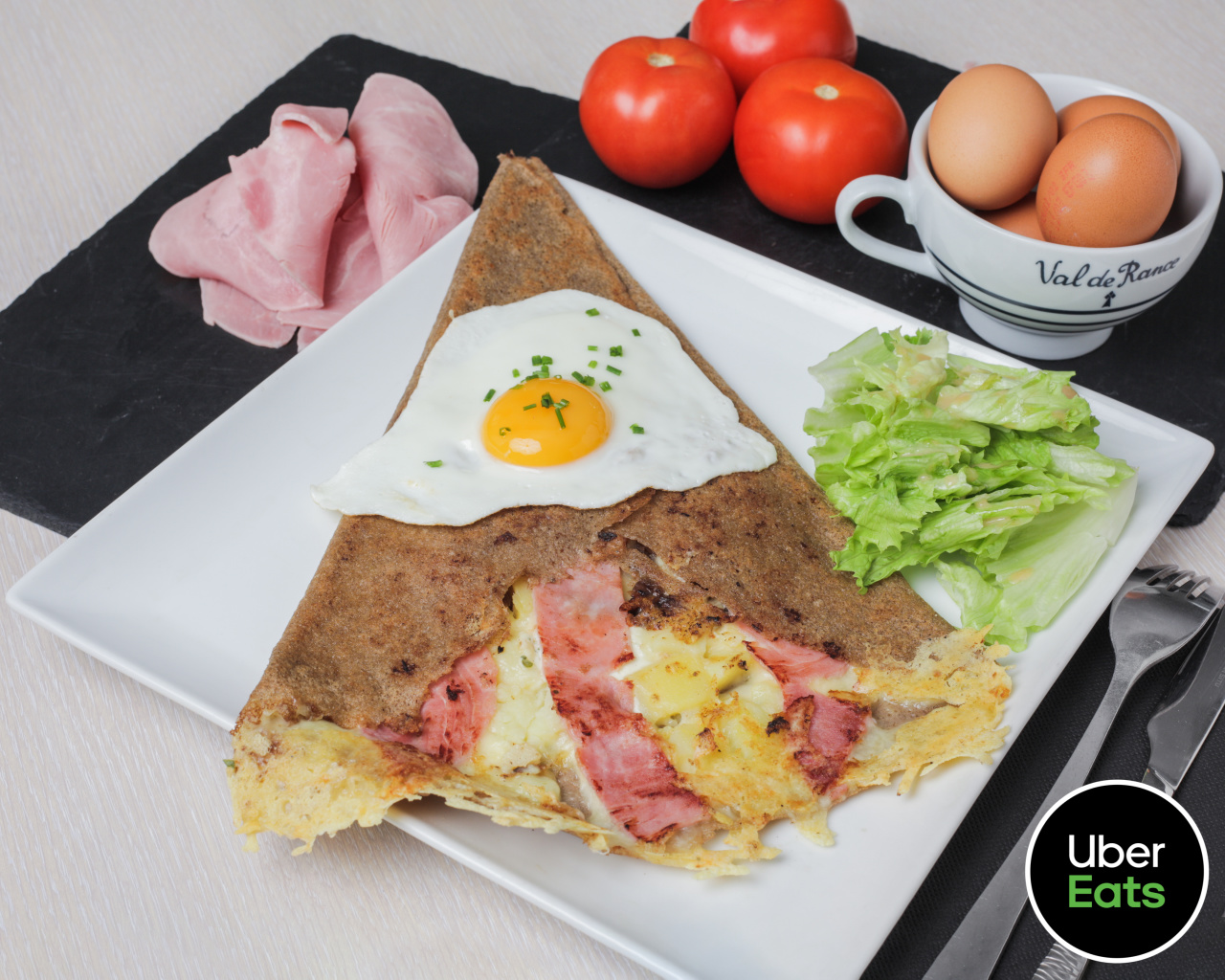 œuf miroir, jambon, emmental, salade.