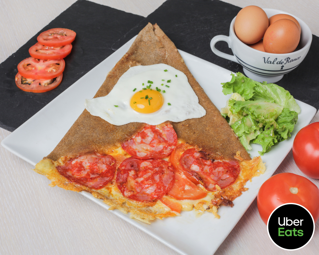 Emmental, tomates fraîches, chorizo, œuf miroir, salade.