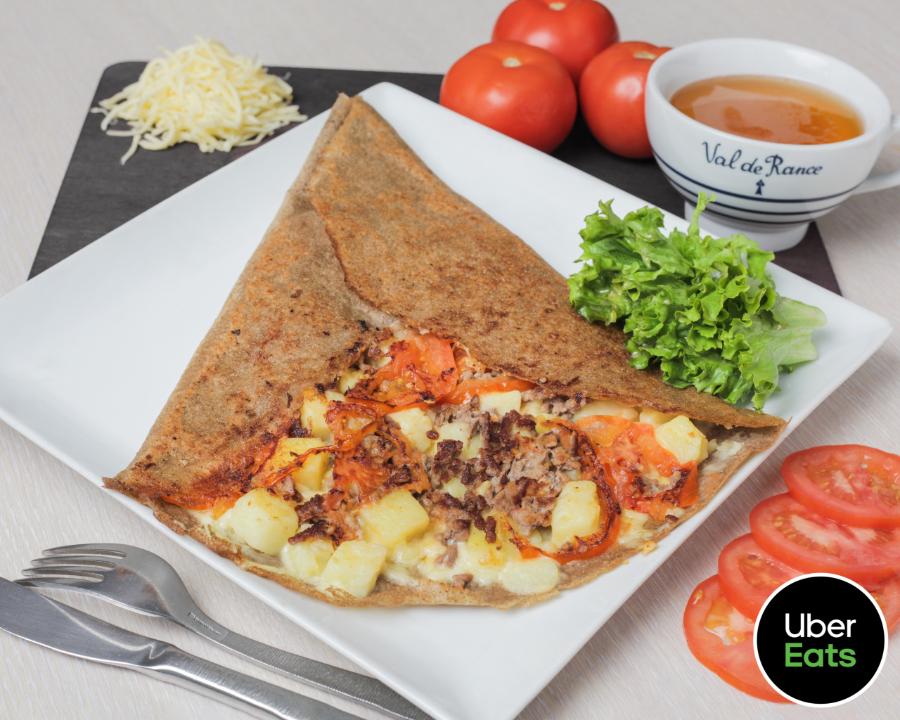 Steak haché, pommes de terre, emmental, fromage ail et fines herbes, tomates fraîches salade.
