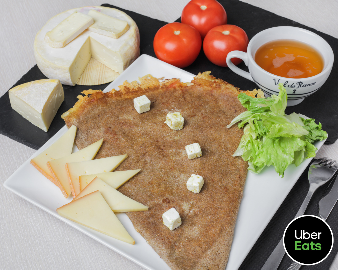 Raclette, crottin de chèvre frais, reblochon, dés de feta, salade.