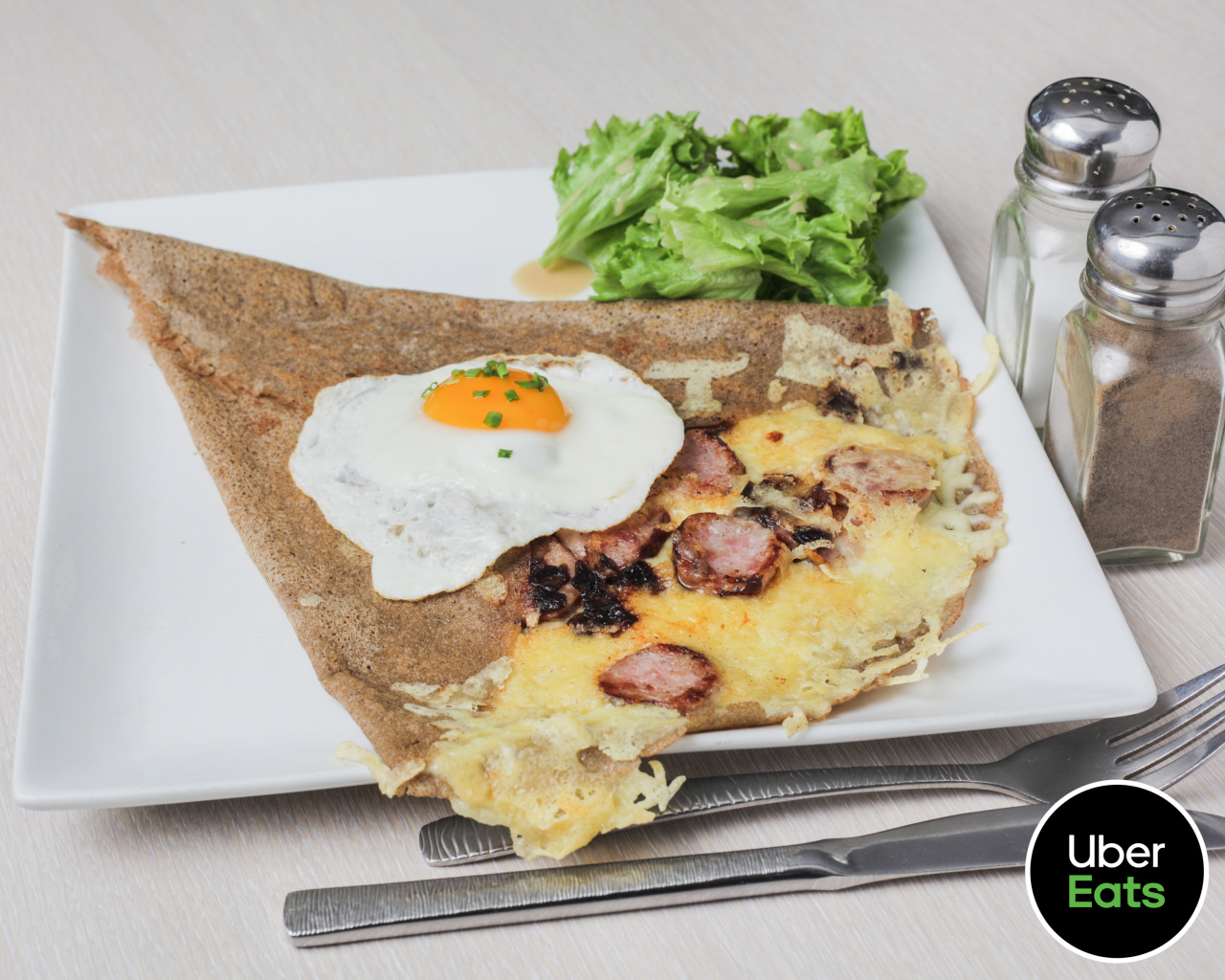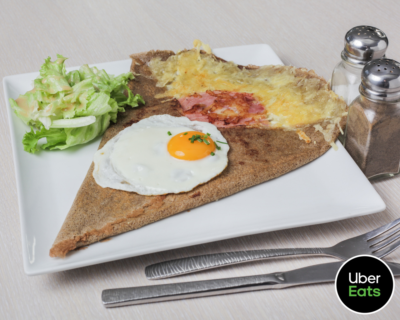 œuf miroir, jambon, emmental, salade.
