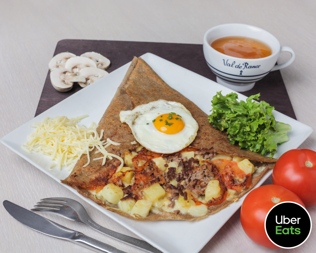Steak haché, emmental, tomates fraîches, œuf miroir, champignons, salade.
