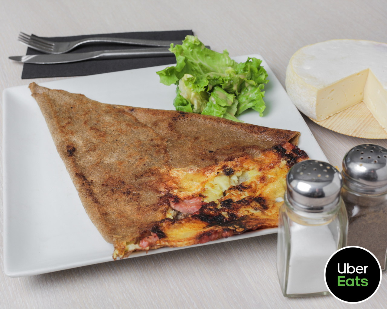 Emmental, pommes de terre, steak haché, crème fraîche, œuf miroir, Sauce au poivre OU sauce au bleu OU sauce moutarde maison, salade