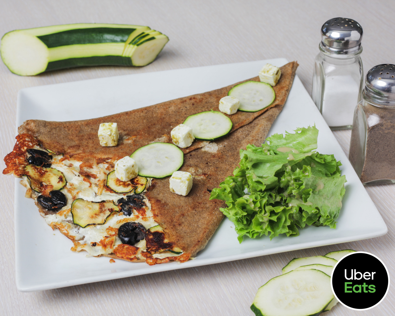 Crottin de chèvre frais, dés de feta, marinade de basilic, courgettes grillées, olives noires, salade.